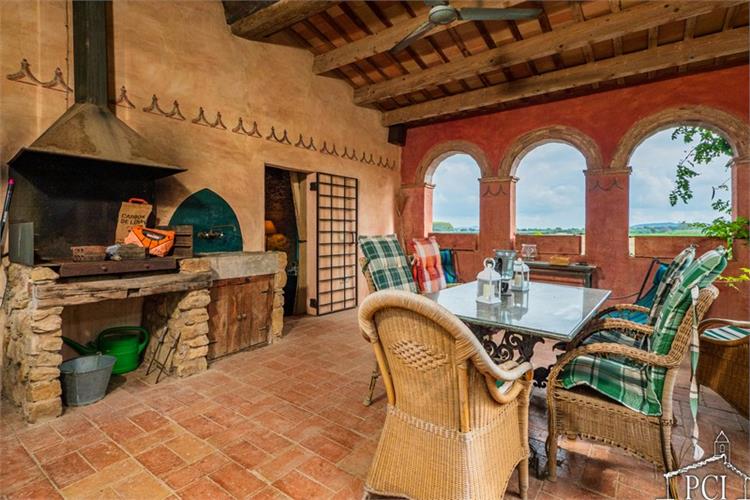 We are greeted by a nice reading/TV room. Rustic style well equipped kitchen with all the necessary utensils and appliances: American fridge, dishwasher, microwave, gas stove with oven. Very spacious dining room with a large wooden table, living room with large fires place and access to a very pretty covered terrace with BBQ and dining table. From the living room is a door leading to an external staircase that takes you to the private pool and garden. The fifth bedroom (twin beds) with en-suite shower room is also on this level.