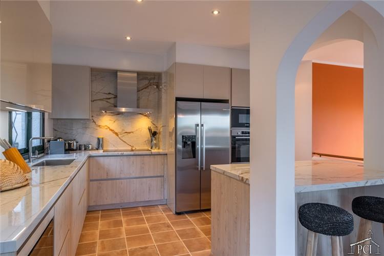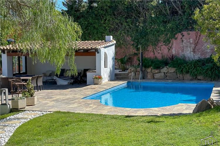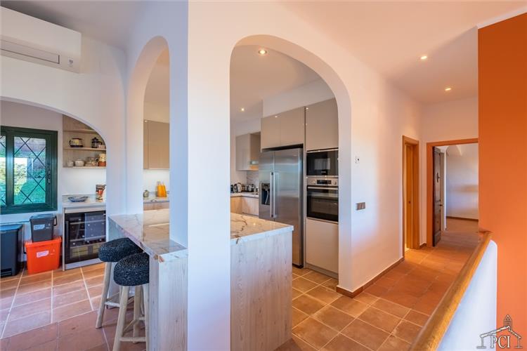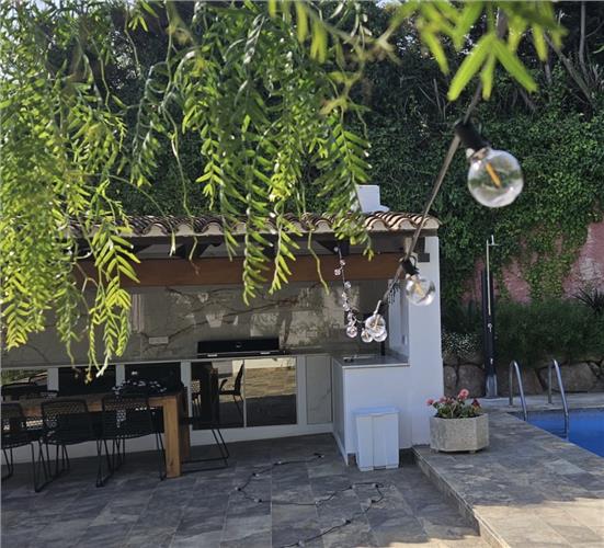 The pool has walk in steps and is surrounded by a large terrace with fitted seating, loungers, umbrellas and an amazing outdoor kitchen (with various BBQ, fridges, dishwasher and sink) eating area and stunning sea views.