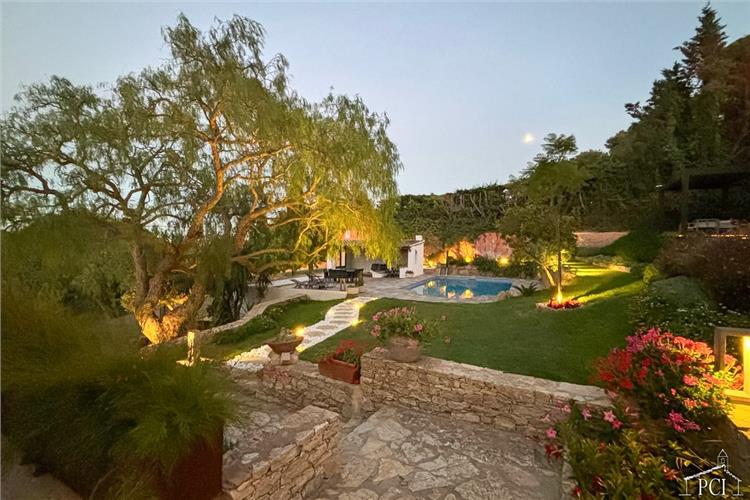 The large sloping garden around the villa has been beautifully cared for and has large mature shrubs, fruit trees and large lawn. There are large wooden steps leading to a wood platform with pergola giving amazing views over the garden, pool and sea. An ideal area for sipping a large glass of something enjoying the sunlit (or moonlit) views.